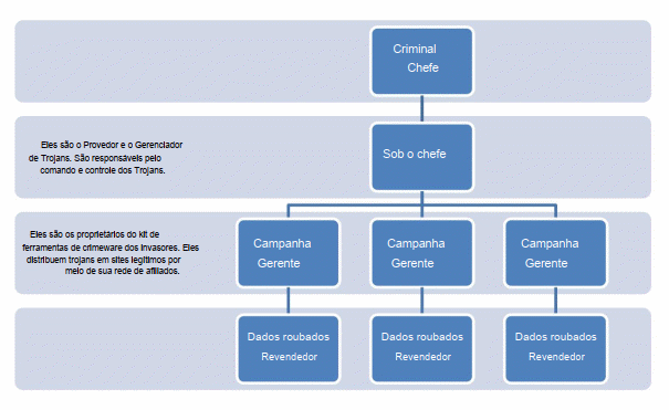 Como o crime cibernético tem se tornado um investimento de baixo custo e risco, muitos crimes estruturados são realizados por organizações hierárquicas que visam grandes organizações financeiras, instituições de defesa, empresas de beneficiamento de urânio (nucleares) e tráfico de drogas. A hierarquia utilizada é ilustrada na figura 3.